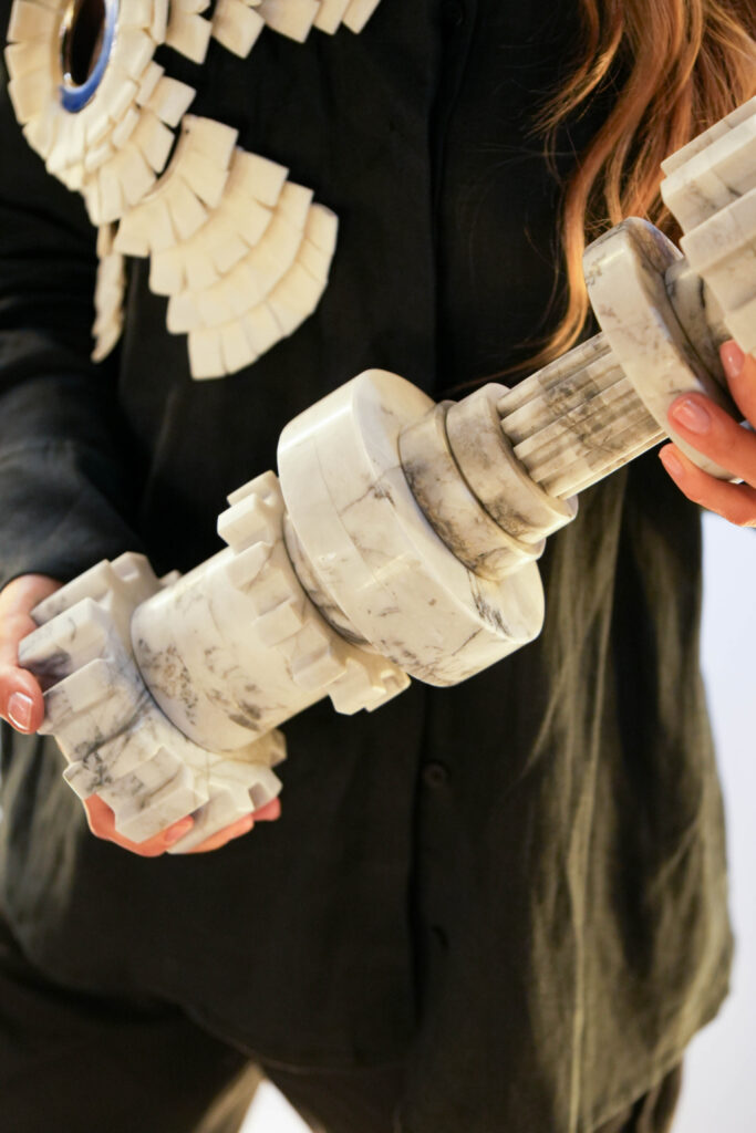 Trabalhada no mármore, material que evoca firmeza e elegância, a coleção traduz memória e afeto em formas que remetem às engrenagens: símbolos de estrutura, resistência e movimento. Um lançamento que une matéria e poesia, transformando lembranças em design atemporal.